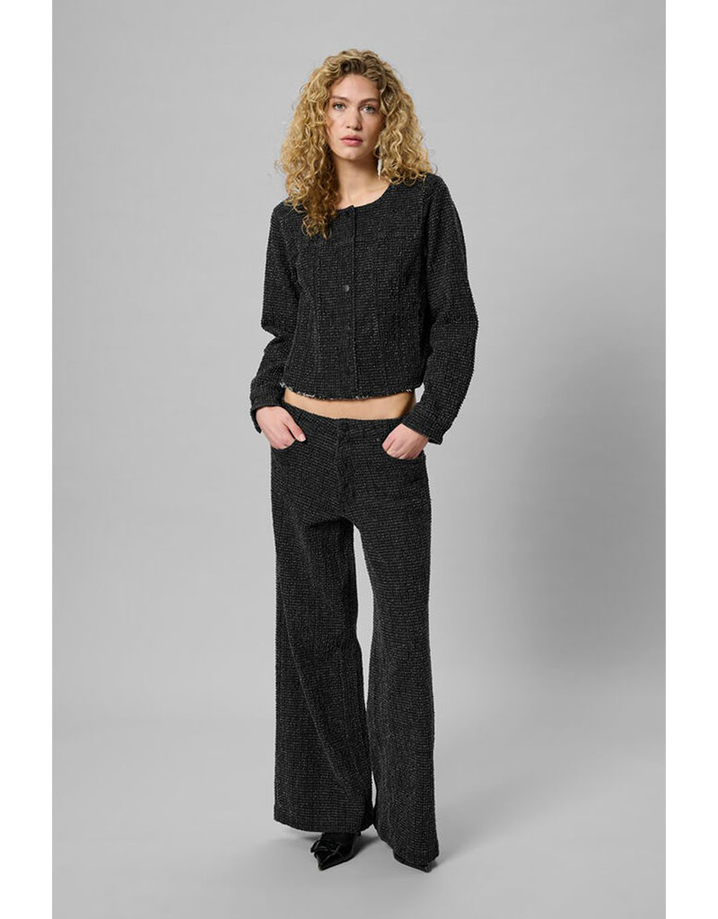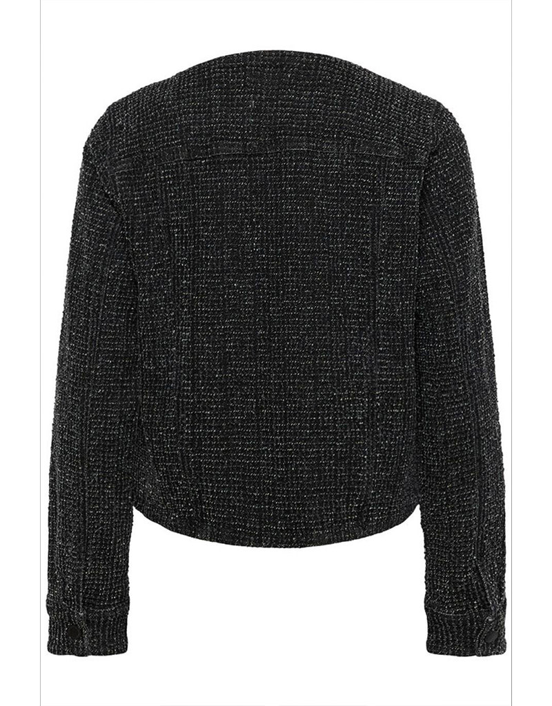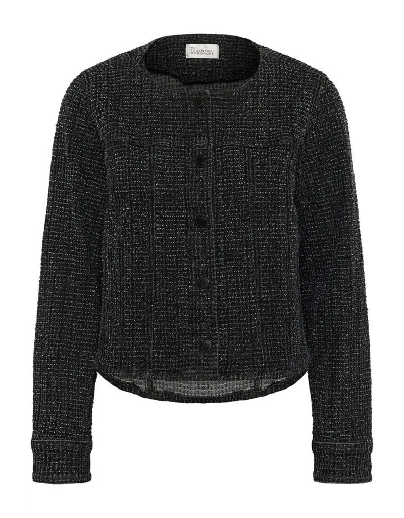 Create an accountTweed jacket with textured finish, straight silhouette and cropped length. Features round neckline, visible seams, and full-length sleeves with front button closure.
